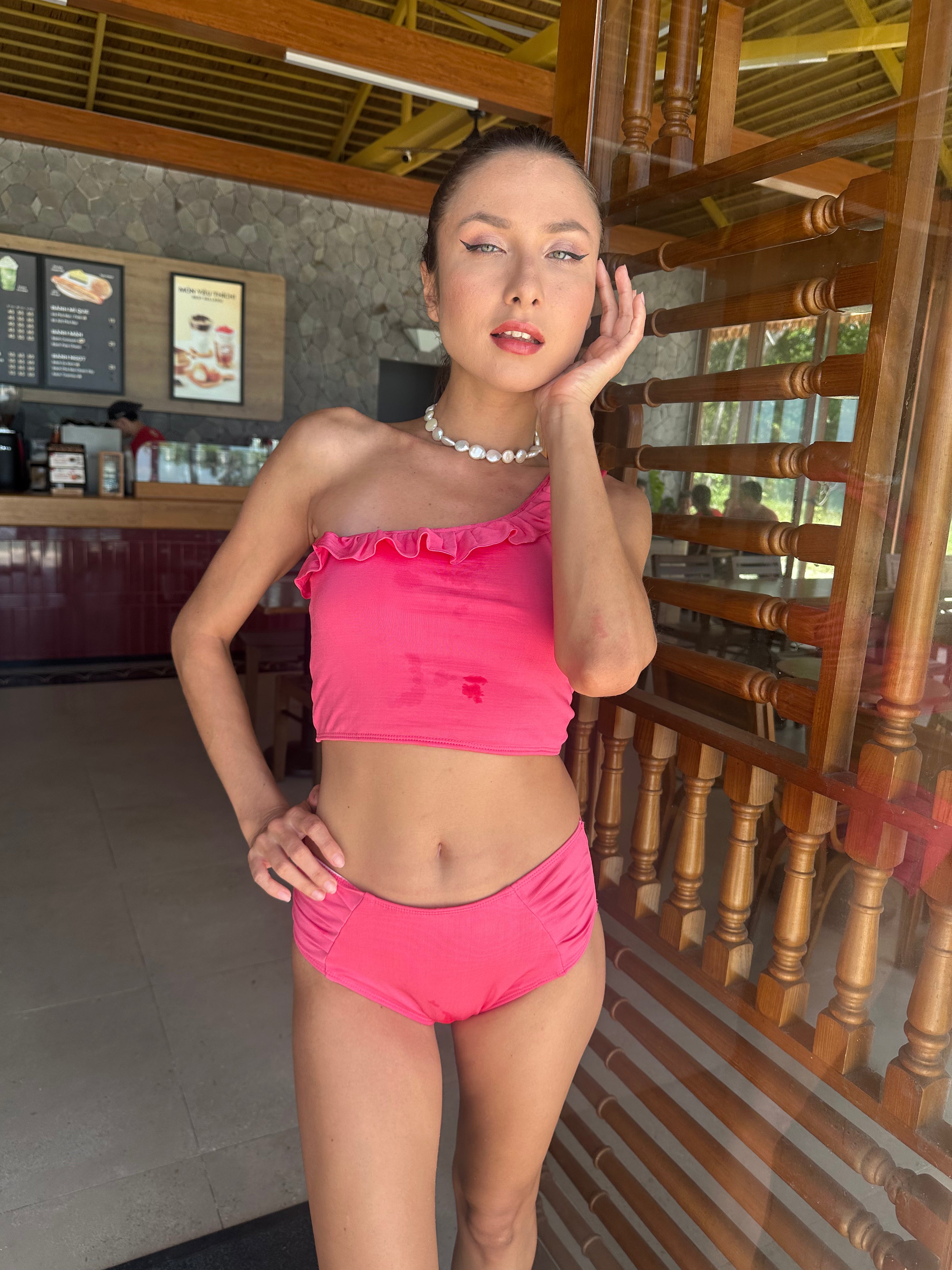 The asymmetrical single-shoulder ruffle adds a playful and trendy touch to the ensemble. This stylish detail not only enhances the visual appeal but also brings a touch of sophistication to your beachwear collection. The ruffle gracefully drapes along the shoulder, creating a captivating look that effortlessly transitions from the water to a beachside cocktail.