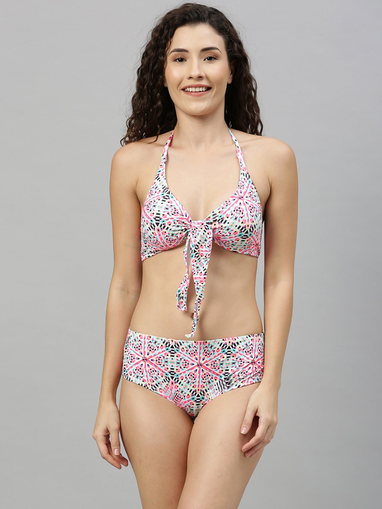 Introducing Berry's Intimatess Knotty Multicolor Abstract Print High Waist Bikini Swimsuit – your perfect companion for a stylish and confident beach day! This stunning two-piece swimsuit blends fashion and comfort seamlessly.