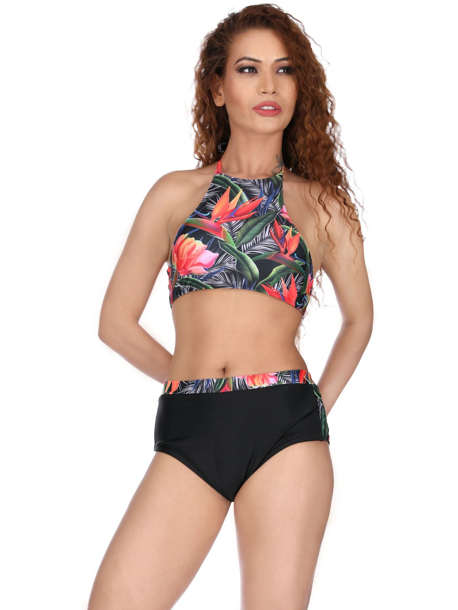 The floral halter neck design offers excellent support and a flattering fit, while the black high waist shorts brief provides just the right amount of coverage, giving you confidence in and out of the water. Whether you're lounging by the pool or taking a dip in the ocean, this swimsuit ensures you'll feel both chic and comfortable.